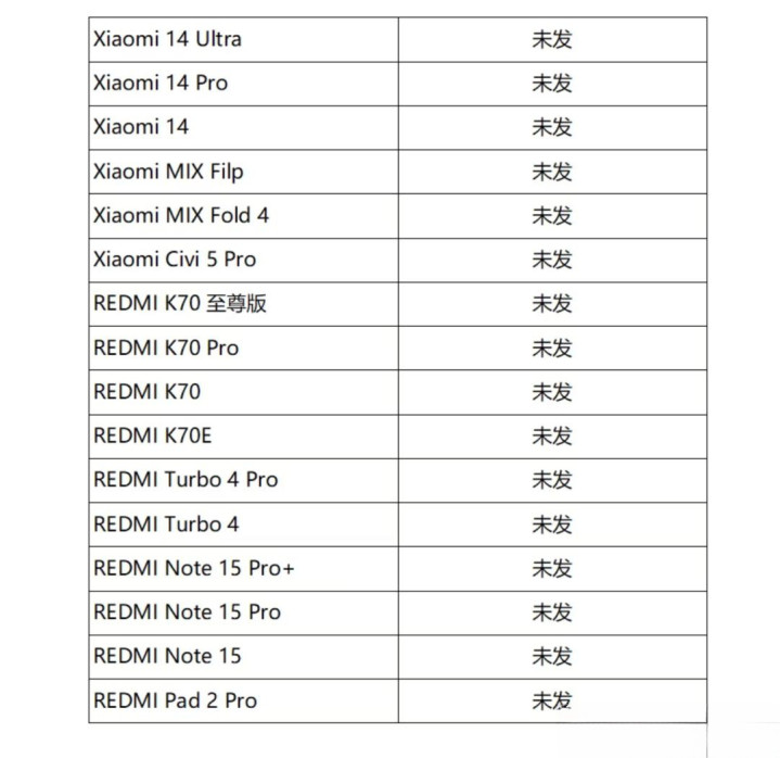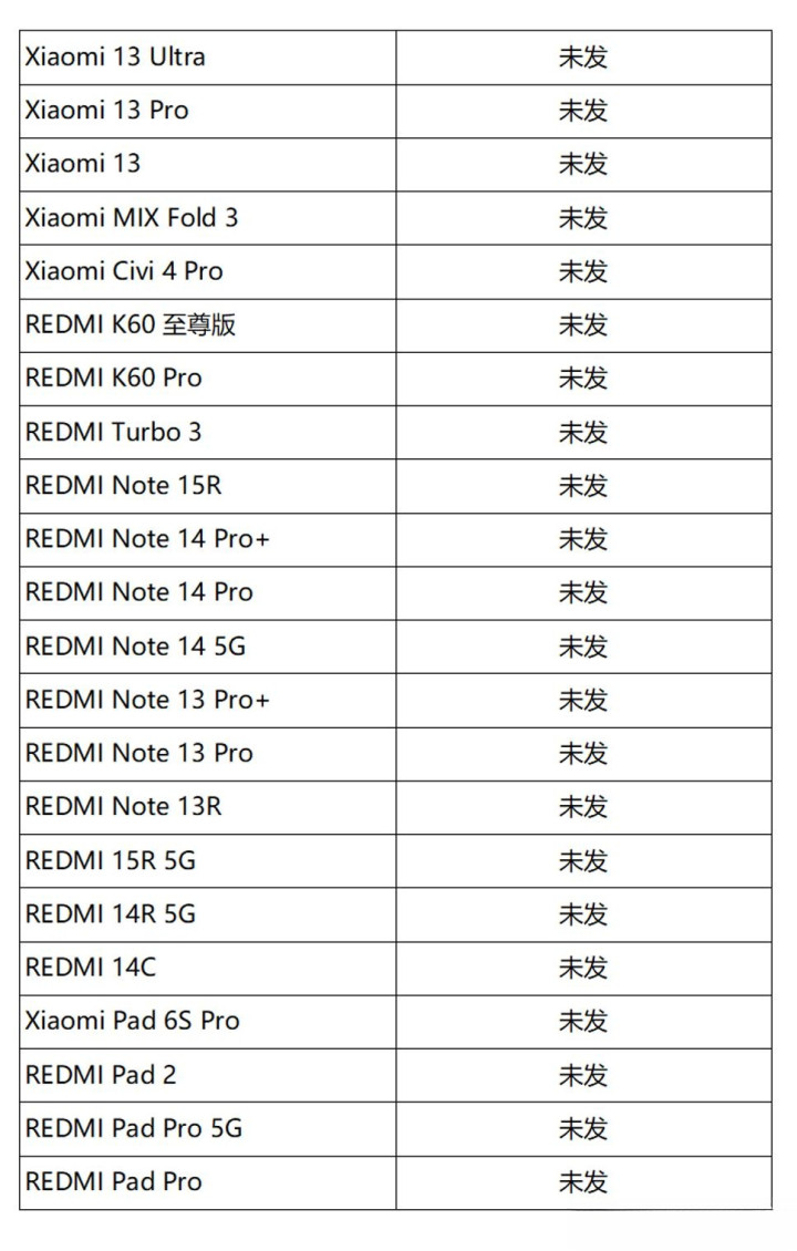小米澎湃OS升级机型表格 :列有第二批适配机型,均标注未发