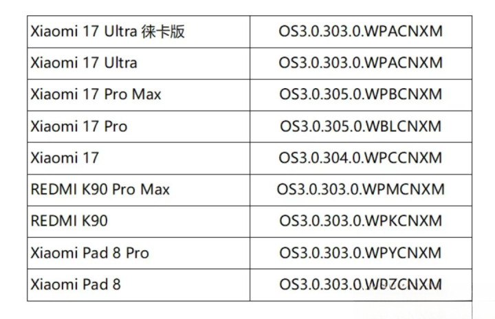 小米澎湃OS升级机型表格 :列有首批适配机型及对应系统版块
