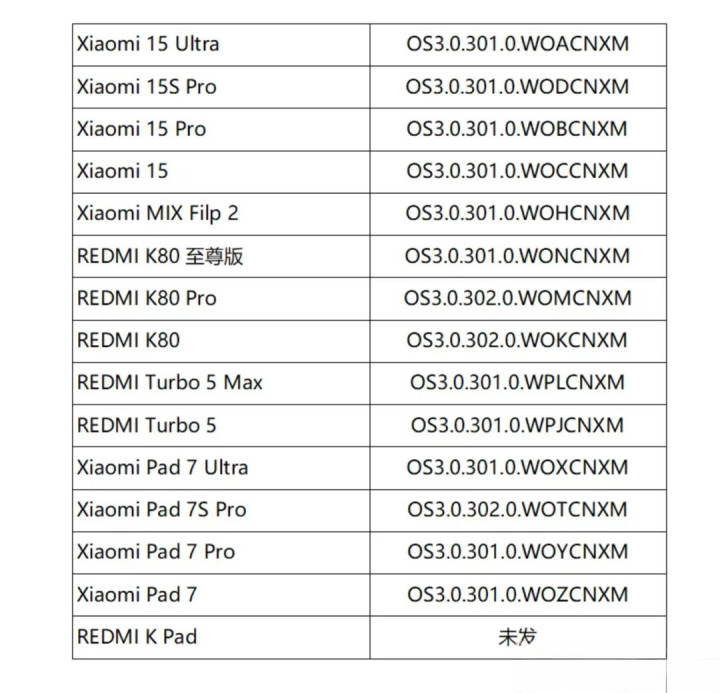 小米澎湃OS升级机型表格 :列有第三批适配机型及对应系统版块