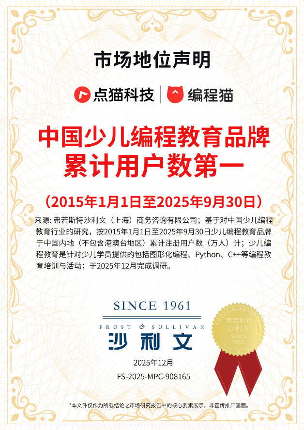 行业招供度赓续突显,更印证了其编程教育范围的领军地位。据弗若斯特沙利文认证,点猫科技旗低品牌编程猫稳居“中国少儿编程教育品牌累计用户数第一”;CIC灼识计划调研领悟,编程猫成为“家长首选的少儿编程教育品牌”,同期连气儿斩获“年度影响力企业”“年度AI教育影响力品牌”等多项行业大奖,用实力奠定了在东说念主工智能与编程教育赛说念的领军底色。