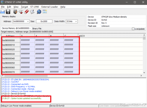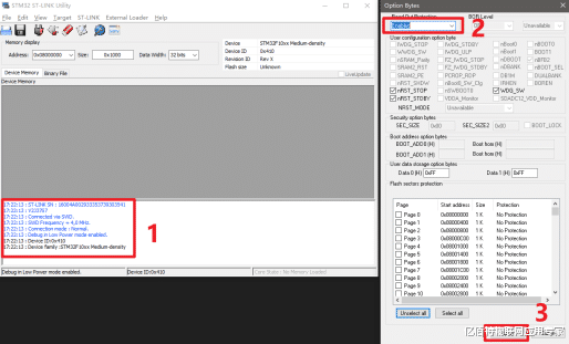 芯片被锁:使用ST-LINK Utility解锁选项字节;
