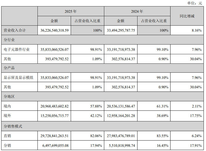 销售区域方面,境内完了买卖收入 209.68 亿元,同比增长 2.11%,占总营收的 57.88%;境外完了买卖收入 152.58 亿元,同比增长 17.75%,占总营收的 42.12%,境外市集推崇亮眼。销售模式上,直销收入 297.29 亿元,同比增长 6.24%;分销收入 64.98 亿元,同比增长 17.91%,多元销售渠说念协同发展。
