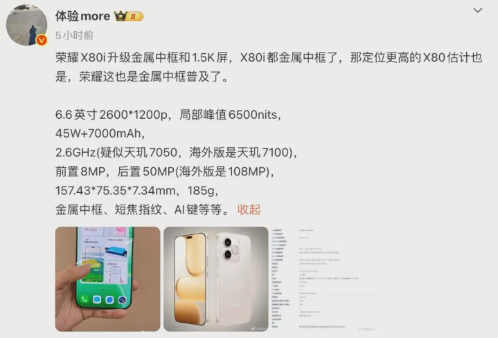 最让我有时的是,爆料提到荣耀X80i升级了金属中框。