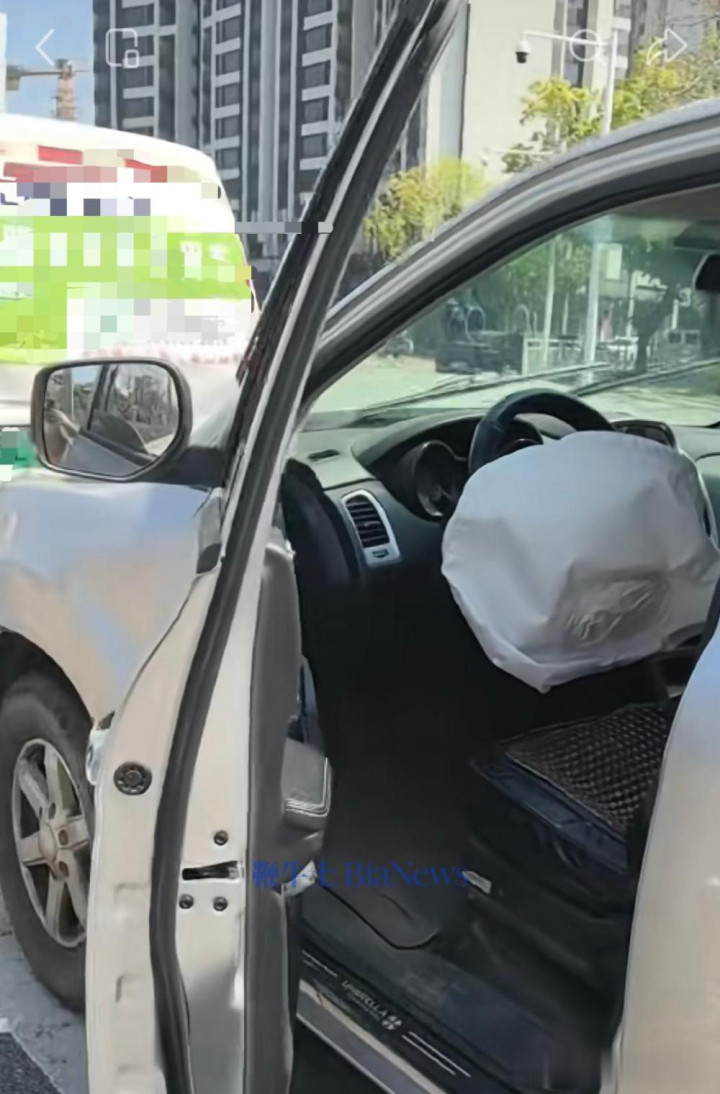 位于终末方的银色车辆毁伤最为严重,引擎盖严重朝上弯折、变形,前保障杠突破,右侧大灯灯罩禁闭,前格栅也被撞毁,车内安全气囊弹出。