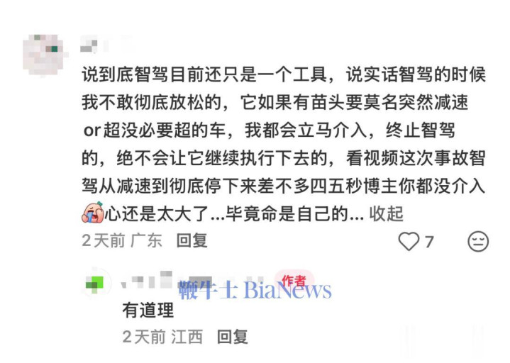 还有网友觉得,现在,智驾仅仅用具,必要时一经需要驾驶员介入,非论若何,齐要以安全为重。