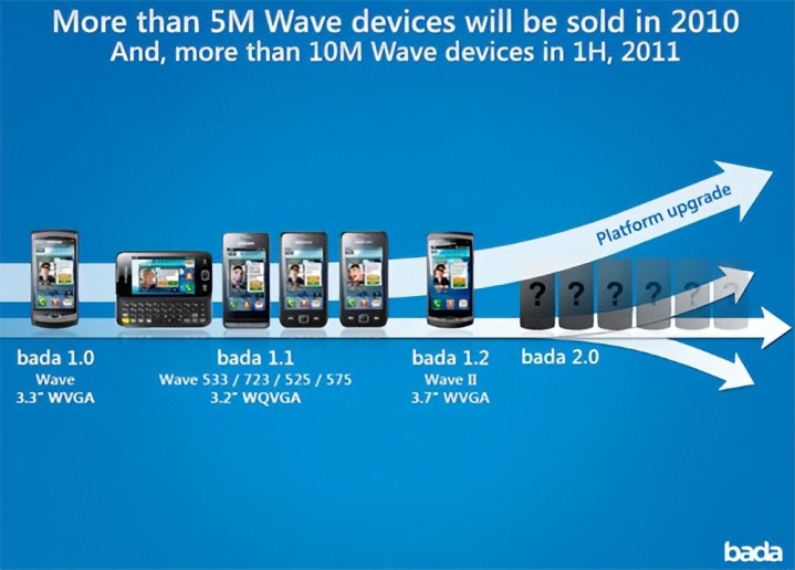 截止到2010年底:三星Bada系统手机销量仍是冲破500万,2011年上半年,Bada系统智妙手机的指标销量为1000万。