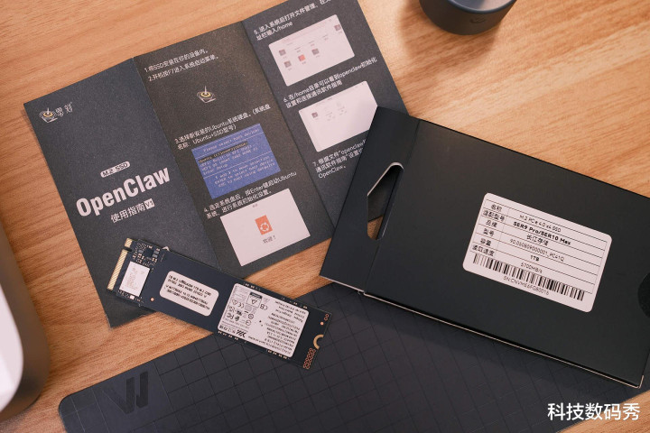 那这块硬盘亦然有单独包装的,盒子外不雅是零刻BeeLink的英文记号以及龙虾的可儿图案,从背部信息不错看出这是张1T的长江存储的M.2 PCIe4.0固态硬盘,读写速率5700MB/s,然后还有一张纸质版的OpenClaw陋劣使用指南。