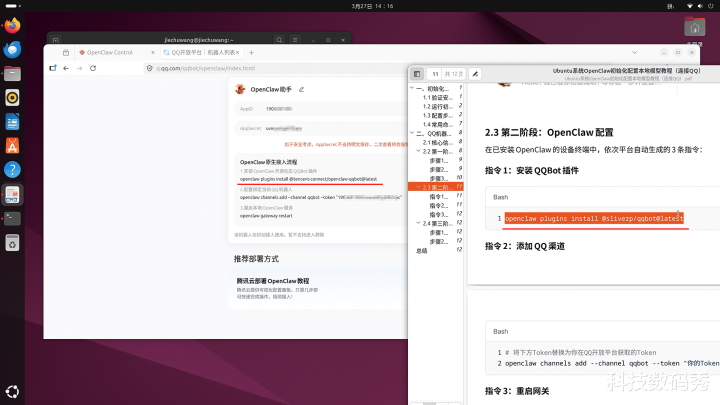 那临了一步虽然是和你的QQ谄媚了,这样不管你东说念主在那儿,独一家里电脑开着,你遍地随时齐不错让它帮你干活儿,只需要在手机上给你的QQBot窗口里发布一条敕令就解决了,这里你不错不按照PDF教程里的敕令去作念,径直按照QQ官网的敕令:openclaw plugins install @tencent-connect/openclaw-qqbot@latest