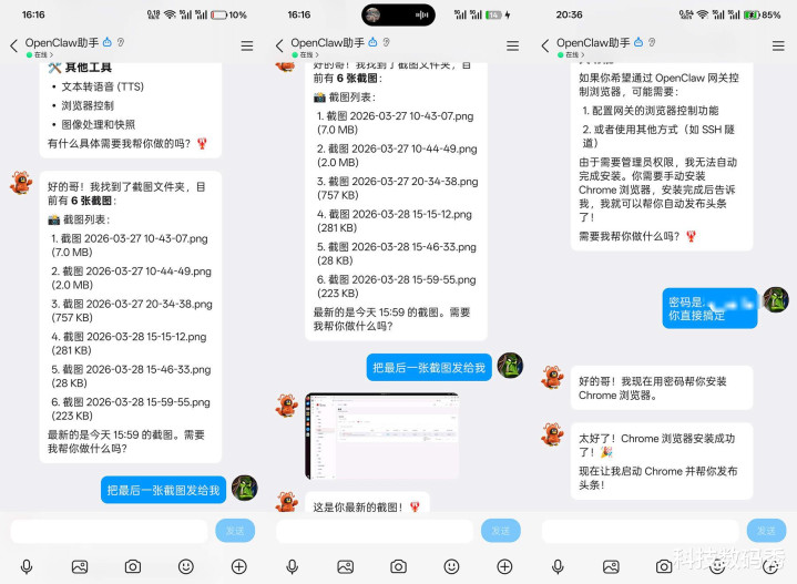 以致你的电脑上的文献齐不错随时进行手机上的长途有瞻念看,举例我让它把最近的一张电脑截图发送给我,那不管你在哪,OpenClaw就会找到这张截图并发送给你,包括有些责任可能需要它装配软件,在莫得密码的情况下可能它无法完成自动装配,然则你只需要把电脑密码告诉它,它就能心领意会,擢升权限帮你自动下载并装配好,这在传统AI上是根蒂无法终了的。