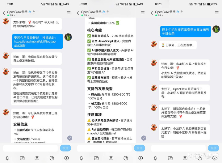 那以往齐是让豆包来汇总,我来筛选并进行手动发布,然则目下有了OpenClaw之后,你以致无需懂任何编程代码,只需要告诉它装配一个当天头条Skill手段,剩下的征集、发布责任全部交给小龙虾就OK了,它,目下就的确成了你的又名助理或者职工。