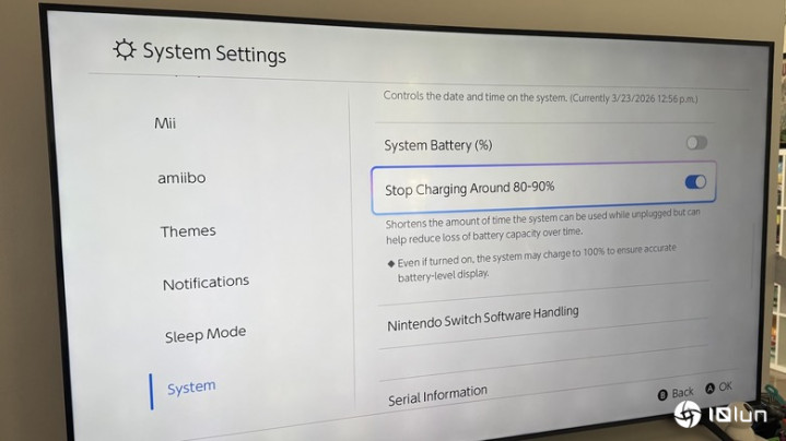 在该选项下方会有辅导,证据启用后在未插电使用时可能会裁减续航时间,但从遥远来看有助于捏造电板老化。需要提神的是,即使开启此功能,Switch 2未必仍会充至100%,以确保电量走漏的准确性。