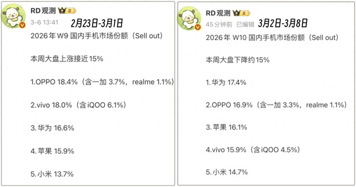 今天共享的是2026年W10国内手机名次榜,对应的时辰是3月2日到3月8日,这亦然3月份第一个周榜单。和上周比拟大盘下降约为15%,同期榜单排名也发生了调动,前五名的差距在彰着放松,呈现出一种百花王人放犯言直谏的场面。其中苹果小胜vivo重归国内第三,OPPO排名第二,华为重返国内周冠军,以下是榜单的明慧本色。