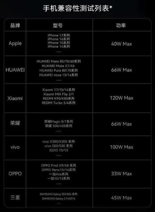 像什么 66W 华为 SCP 、120W 小米倾盆秒充,以及主流的 140W PD3.1 、PPS 等公约皆是兼容的!