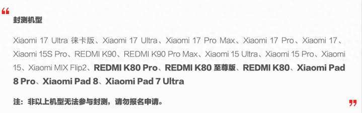 新增封测机型包括REDMI K80、REDMI K80 Pro、REDMI K80至尊版,以及Xiaomi Pad 8、Xiaomi Pad 8 Pro和Xiaomi Pad 7 Ultra。